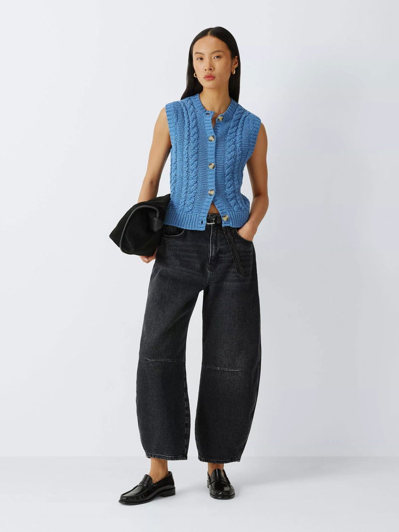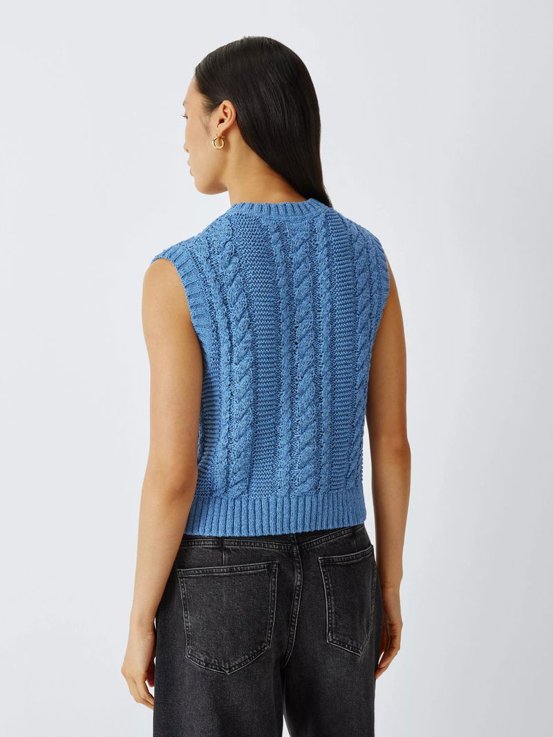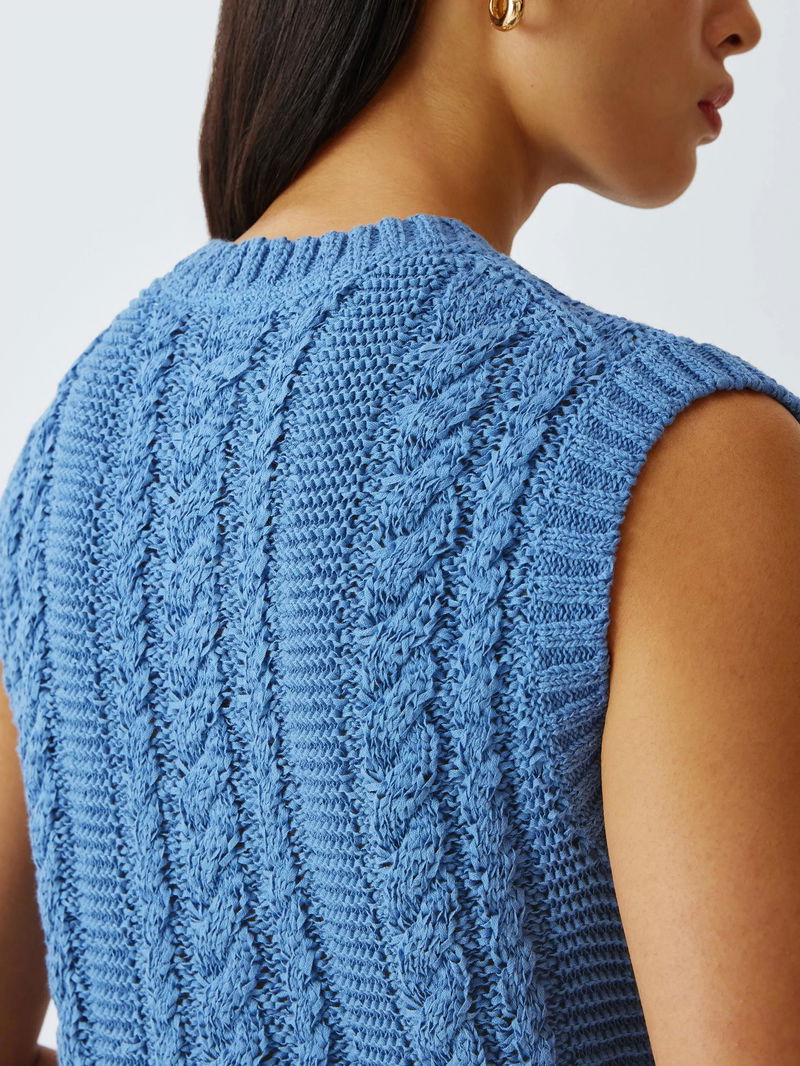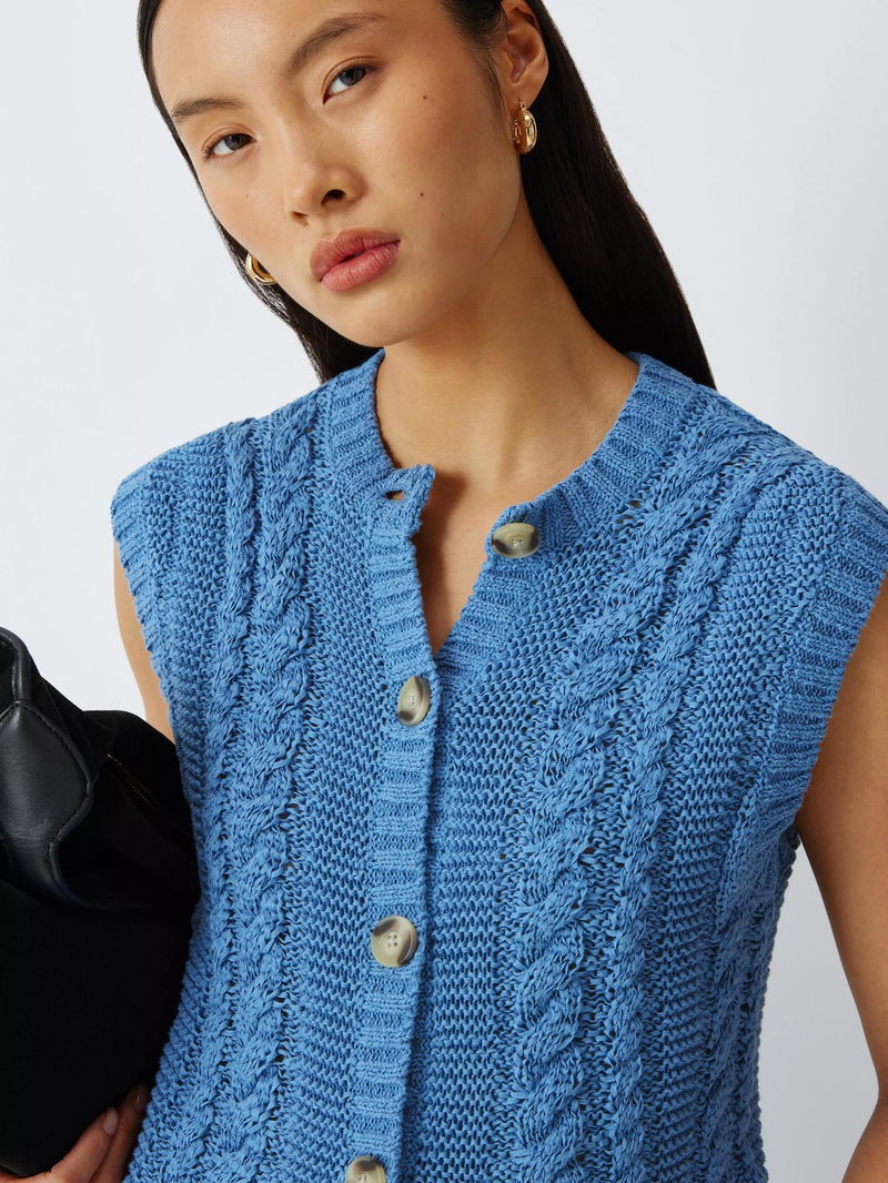 A timeless layer for your seasonal wardrobe. This sleeveless cable knit cardigan features a classic crew neckline and tactile texture for a heritage-inspired aesthetic. The button-through front is finished with chunky, mock-horn buttons for a polished touch, making it an ideal choice for effortless trans-seasonal styling.