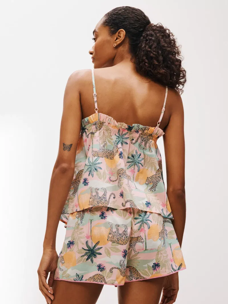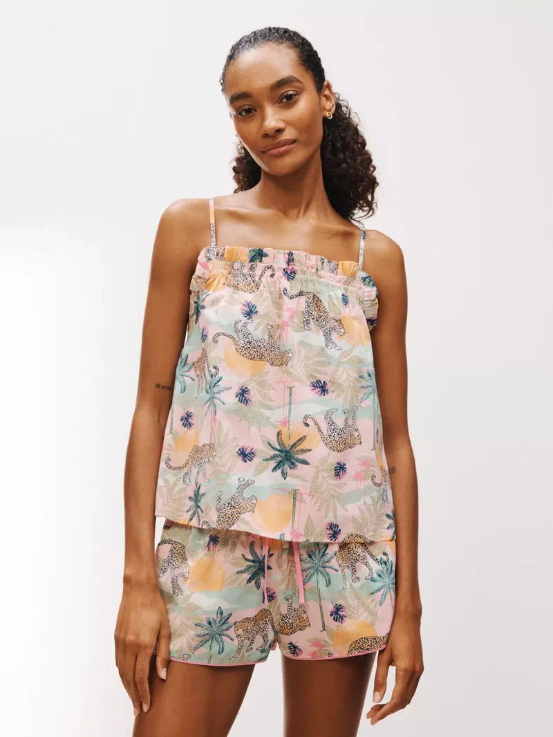A tropical choice for warm, summer nights, we love the Malibu print of this camisole pyjama top. Accented with ruffle neckline for added texture, the spaghetti straps are adjustable for getting the fit perfect.