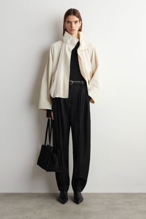 A-line jacket designed with a high collar concealed with a buckle belt closure. Featuring duo slanted welt pockets, and a slit in the back.