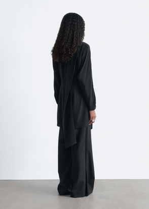 Fitted linen blend mini dress inspired by classic shirting, with an open V-neck collar and an asymmetric overlapping silhouette that secures at the side with three buttons.