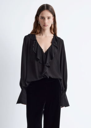Asymmetric ruffle blouse with long sleeves, buttoned cuffs and delicate keyhole neckline. Button closure.