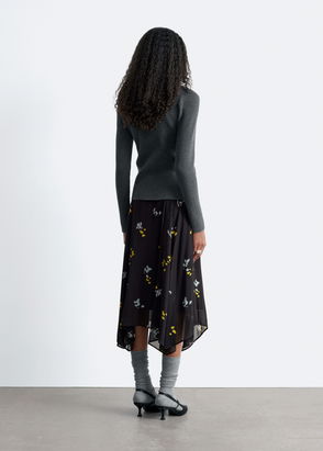 Tulip-shaped midi skirt featuring a voluminous waist with draped folds gathered into a tapered silhouette, and a slit in the back.