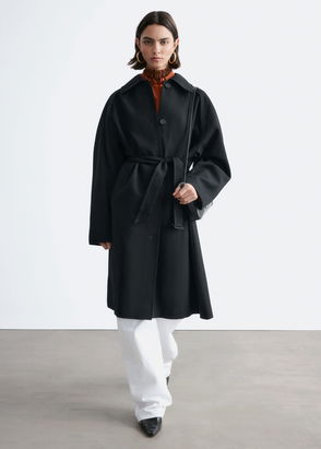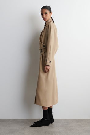 Cotton trenchcoat in a classic A-line silhouette with a self tie belt. Slightly lustrous finish. Slanted side pockets. Centered back vent.