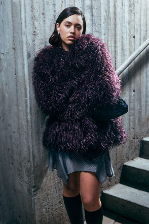 Long faux fur coat designed with leather trims, front hook and eye closures, slanted pockets, and an adjustable leather buckle belt.