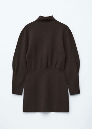 Relaxed mini knit dress featuring a mock neck and a tonal buckle belt.