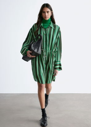 Button down mini dress featuring a self-tie belt, voluminous bodice and fitted bottom. Topstitched details