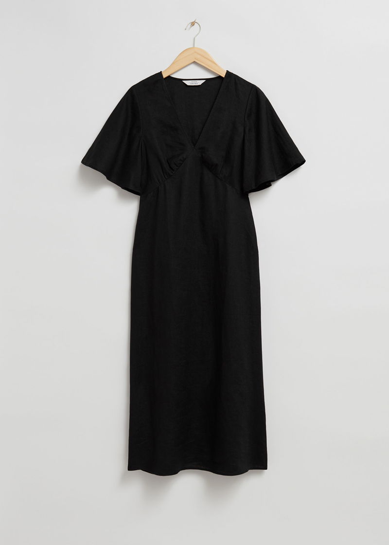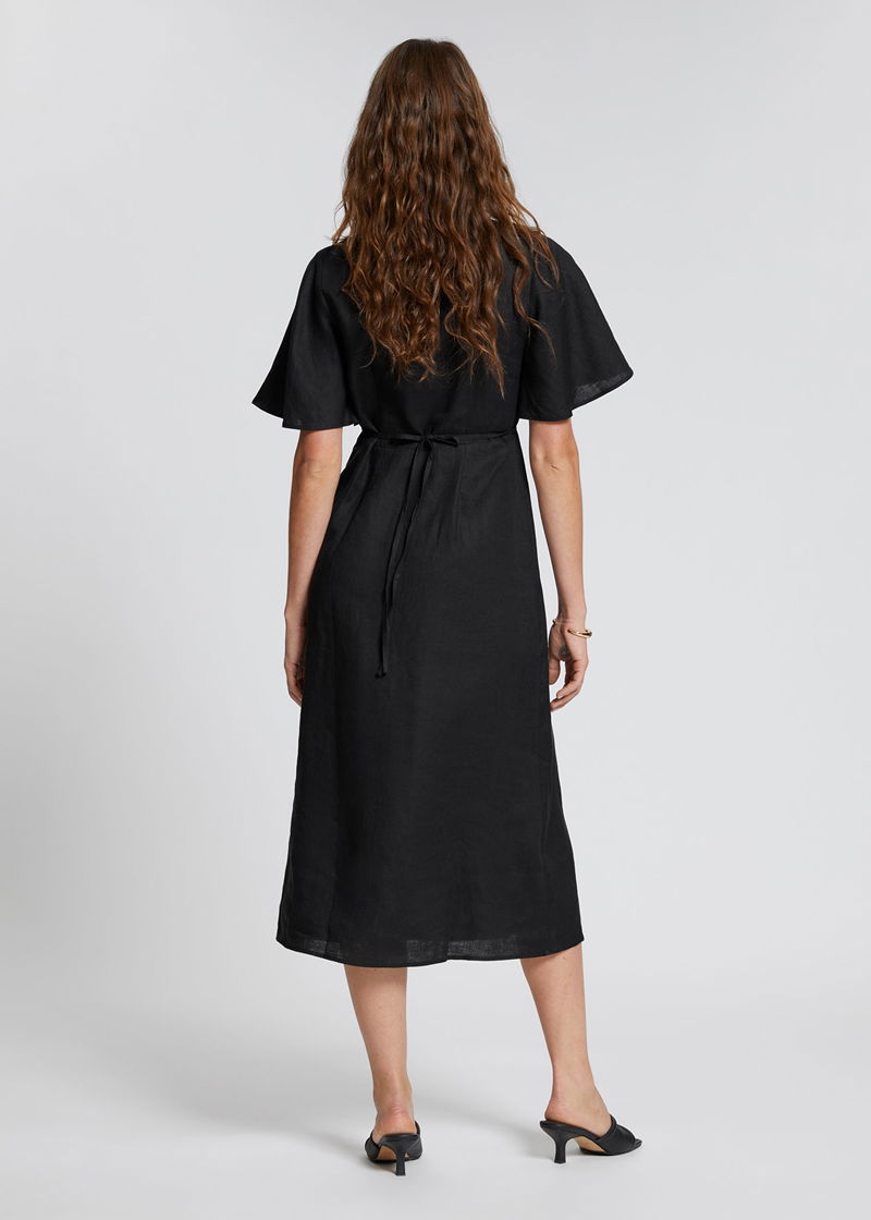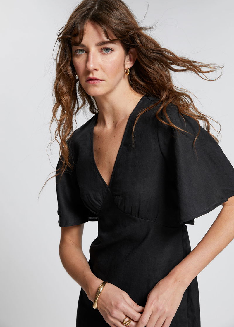 Butterfly sleeve dress crafted from woven linen. Designed with short, gathered sleeves, a v-cut neckline, and a form-fitting silhouette with a long floaty skirt.