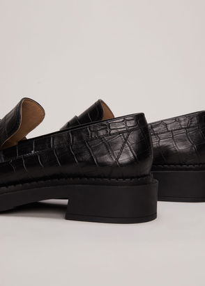 Almond-shaped leather loafers featuring chunky rubber soles and structural topstitching.