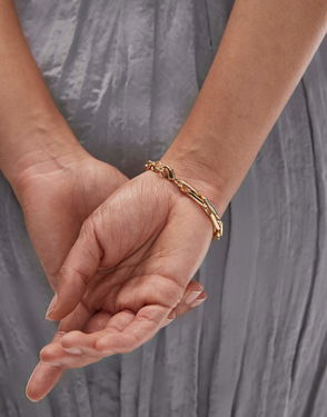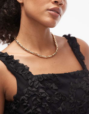 The links have a richly textured, sculptural form, while the flowing chains add contrast and movement—creating a striking, contemporary look. Finished with an adjustable length and a carabiner hook.