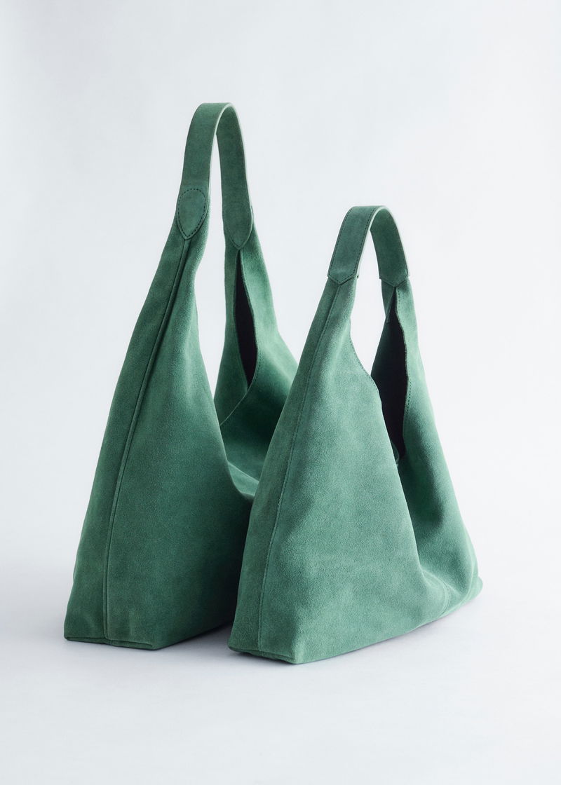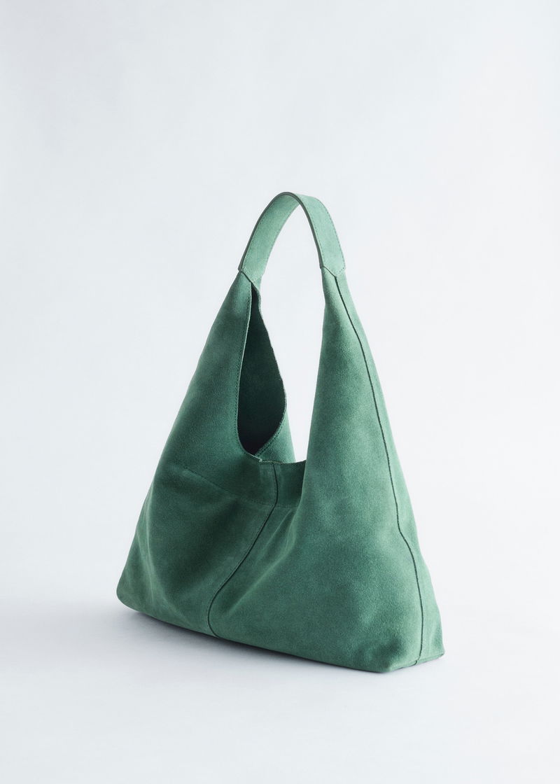 Tote bag crafted from smooth suede with a matte finish and a decorative seam in the middle. This style is detailed with magnetic closure and an inner pocket.