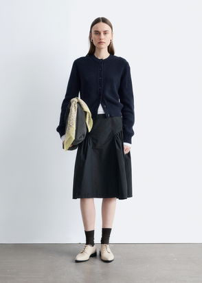 Long-sleeve knit cardigan designed with a rib-knit finished, open collar, and hidden snap buttons along the front.