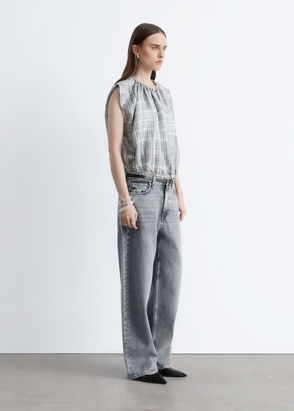 Top crafted from curved, contrasting panels featuring short, wide sleeves and a round neckline.