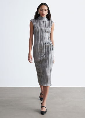 Long-sleeve midi dress defined by a crinkled finish. Finished with padded shoulders. Relaxed fit. Round neckline. Buttoned keyhole closure at the neck.