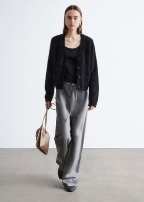 Cropped knit cardigan with self-covered buttons and a boxy silhouette. Voluminous at the bottom the sleeve. Ribbed cuffs and hem.