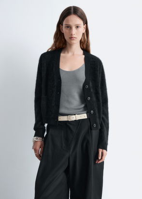 Cropped boxy fit knit cardigan detailed with a three-button closure. Detailed with a cinch rib at the hemline and at the sleeve cuff.