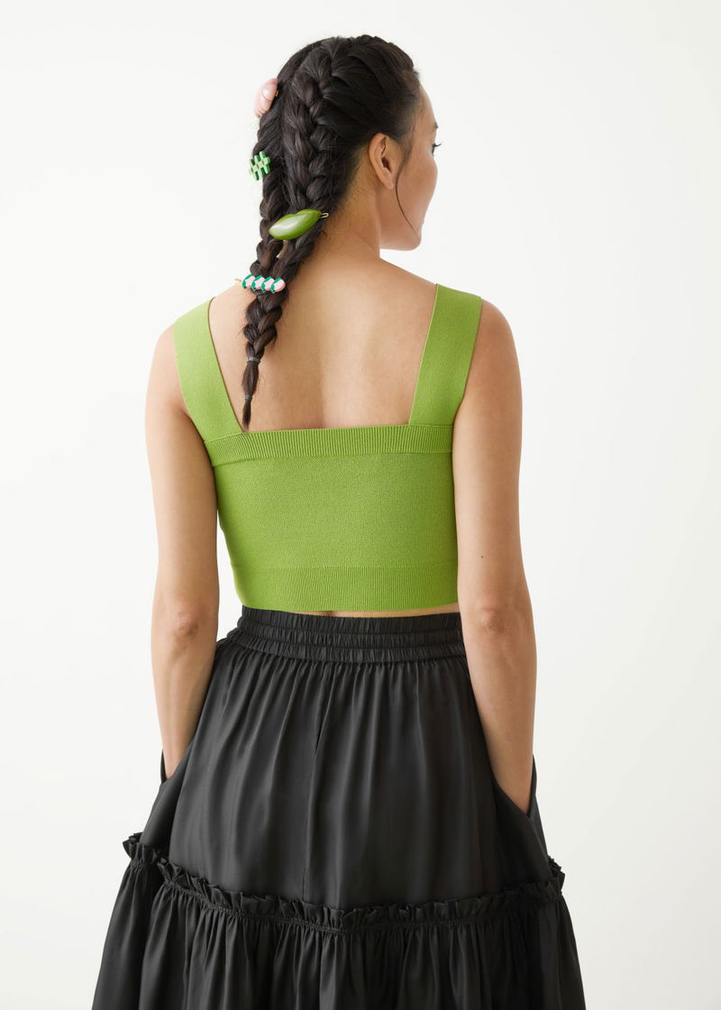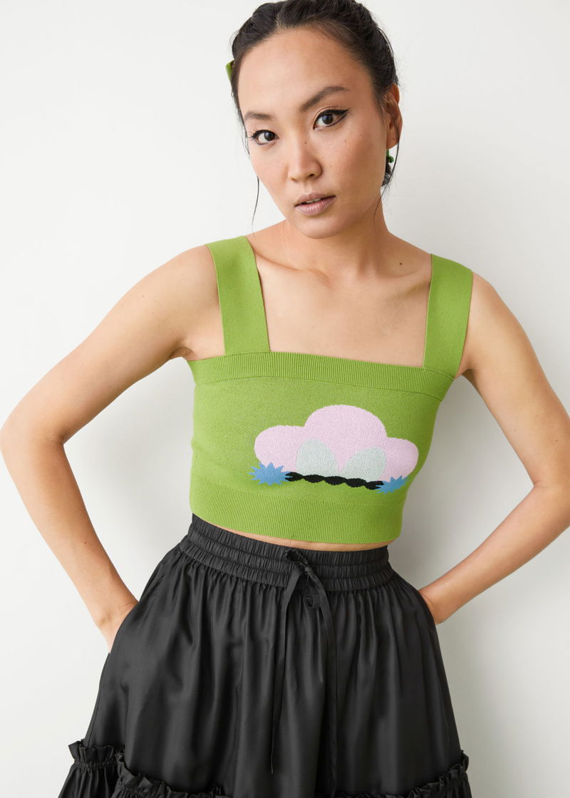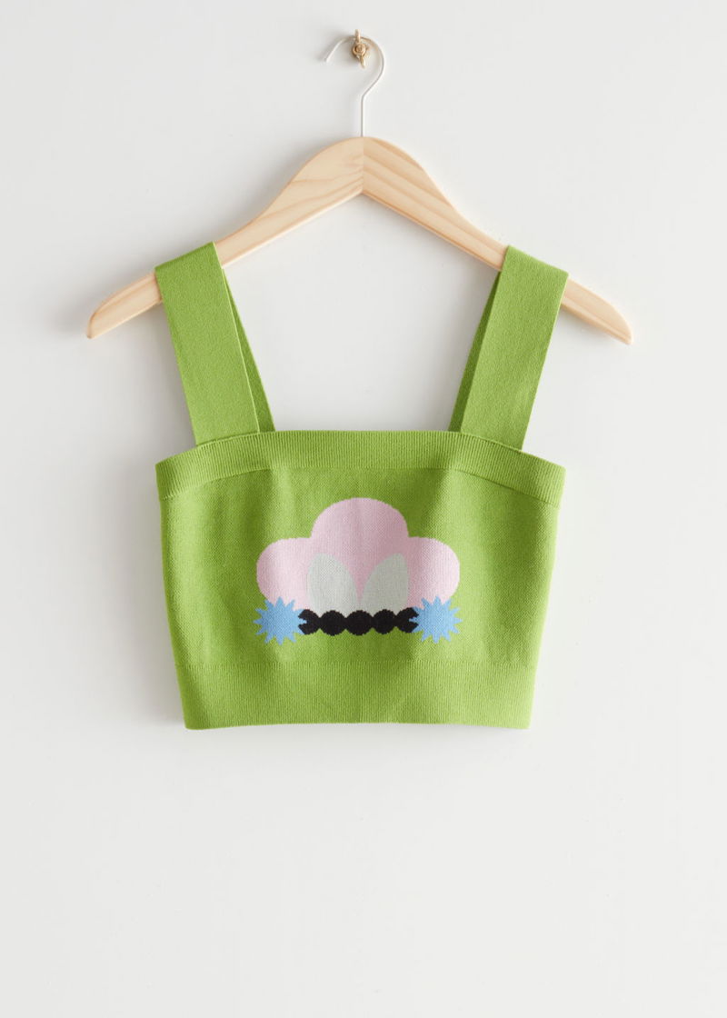 Sleeveless jacquard knit top featuring a playful motif and a cropped silhouette.