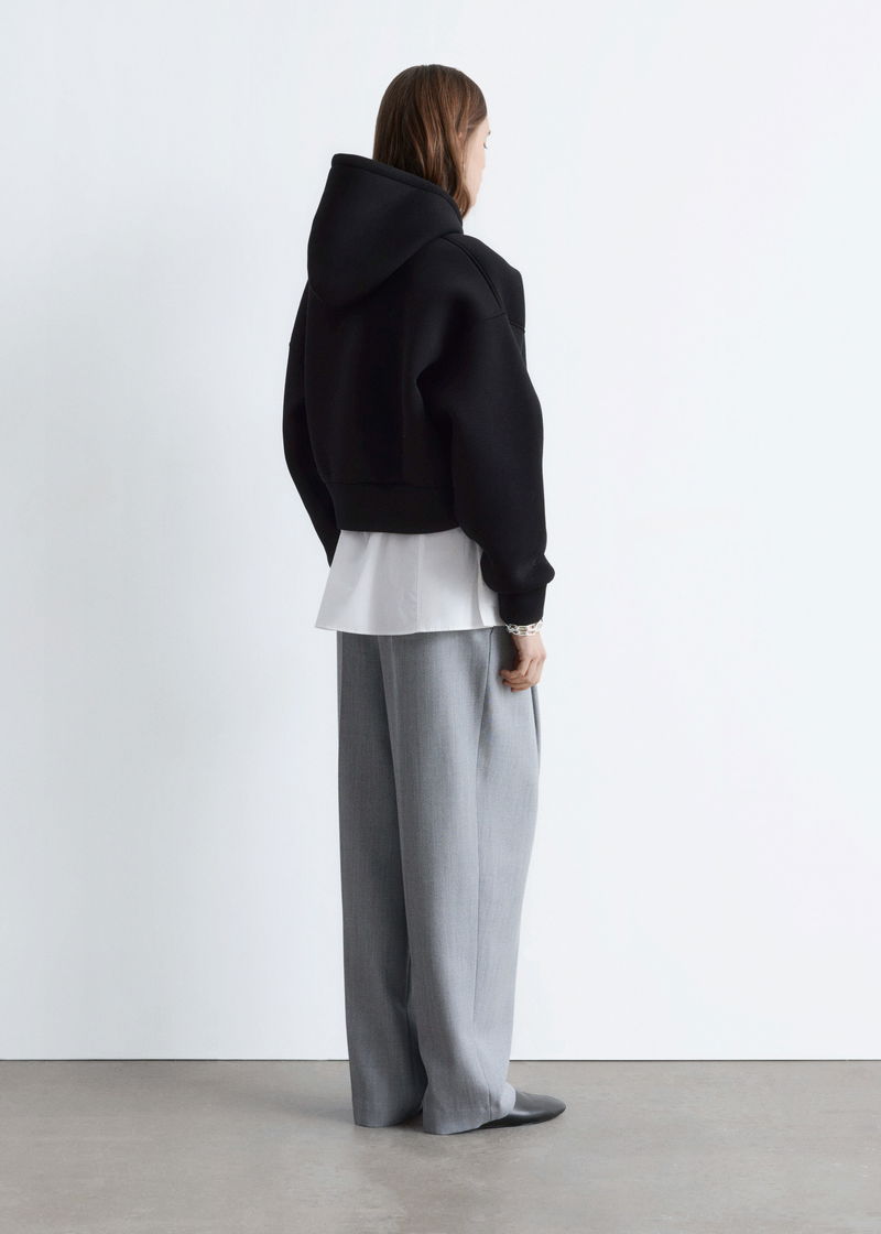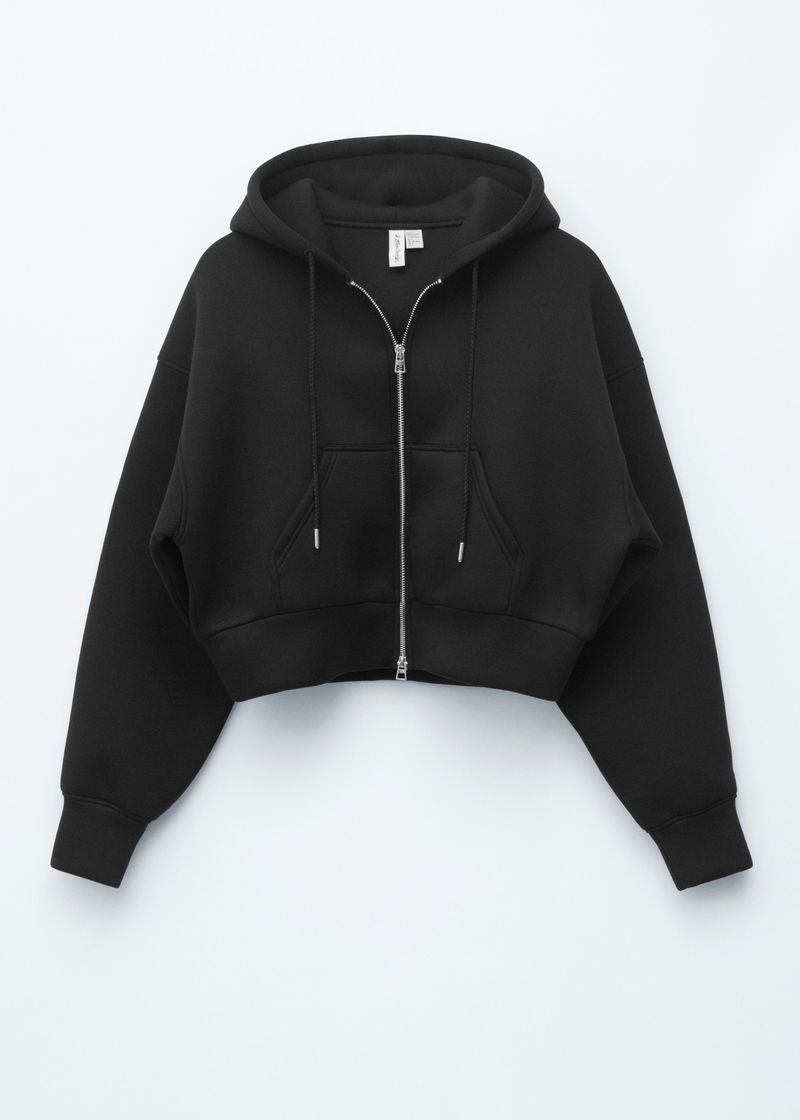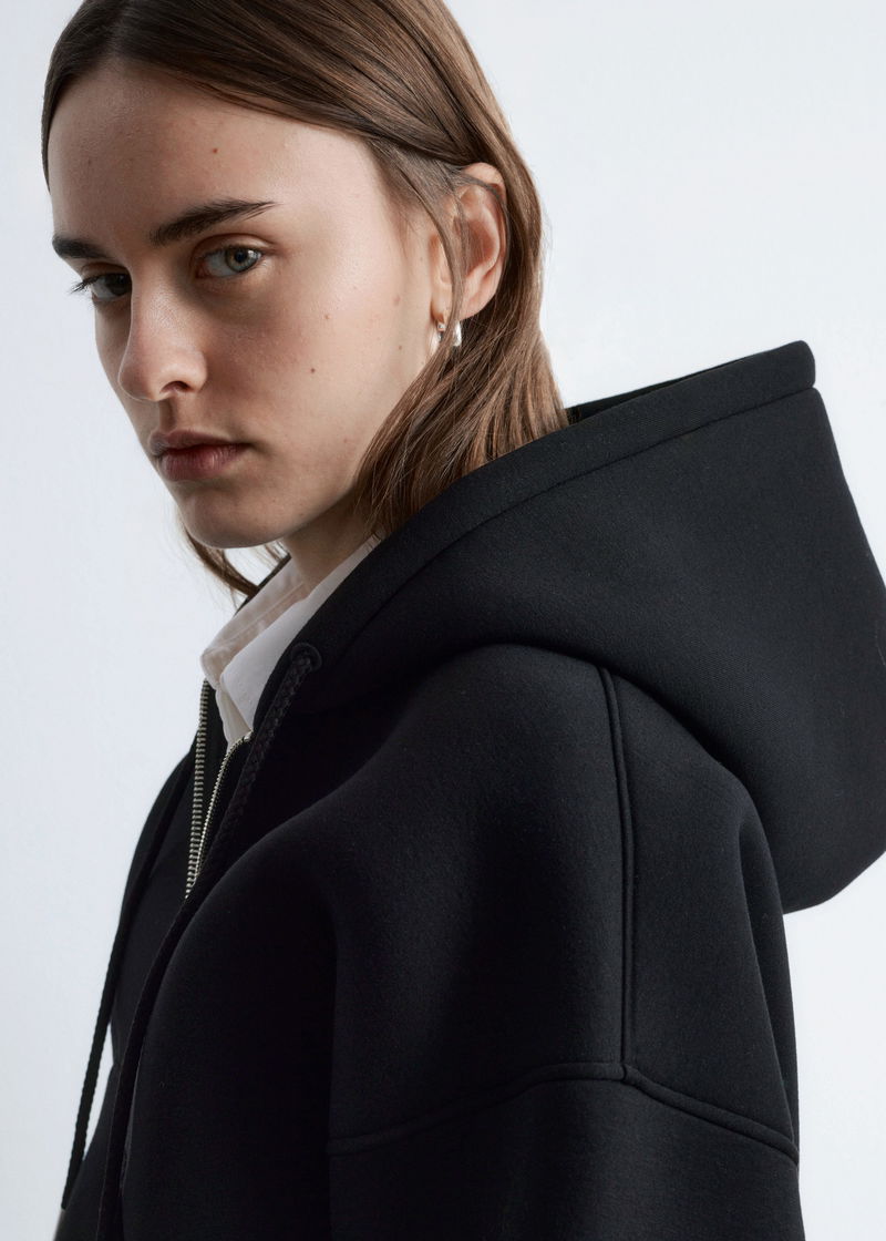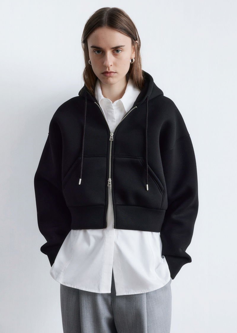 Made from soft scuba fabric, this hoodie is cut in a cropped, boxy silhouette with a roomy drawstring hood, zipped front, and dropped shoulders.