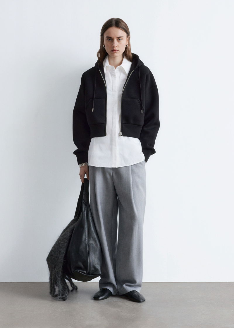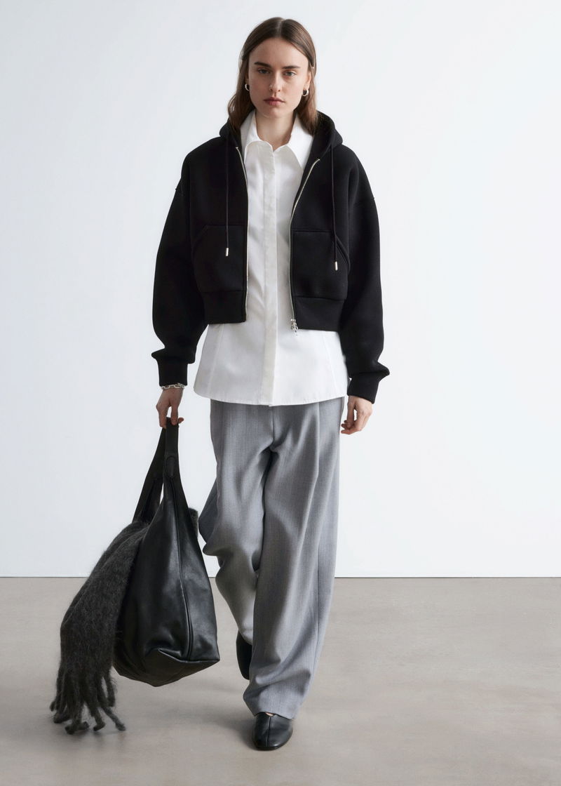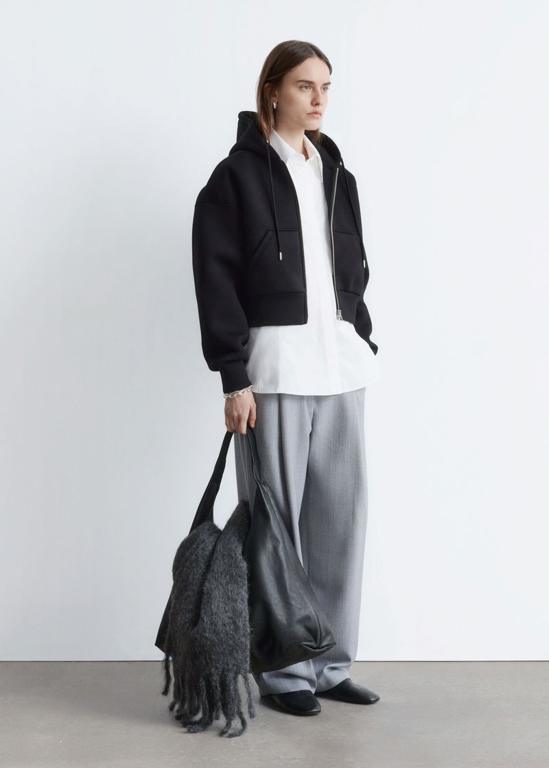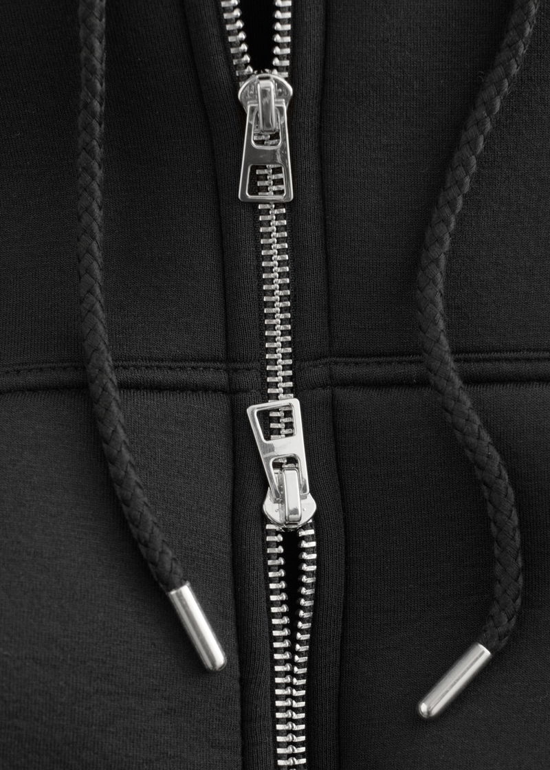 Made from soft scuba fabric, this hoodie is cut in a cropped, boxy silhouette with a roomy drawstring hood, zipped front, and dropped shoulders.