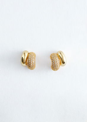 Gold-toned mismatch earrings with dangling rhinestone gems in varying shades and sizes.