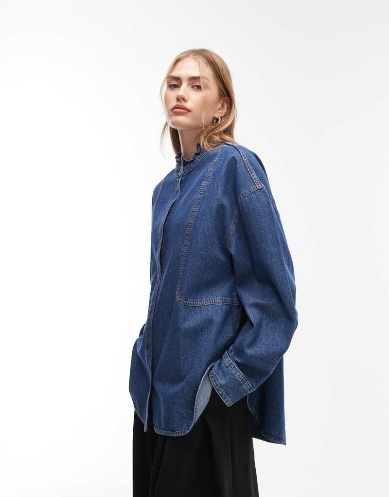 Denim Shirt With Frill Grandard Collar In Blue Wash