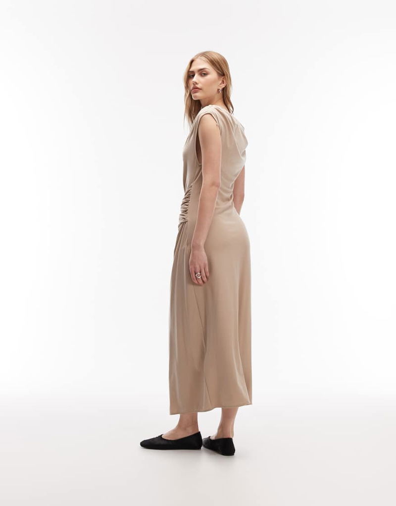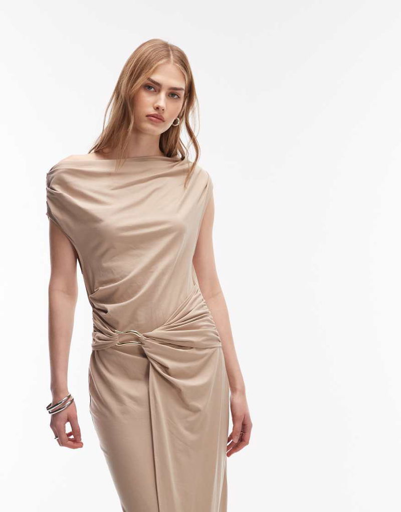Draped Jersey Maxi Dress With Boat Neck And Buckle Detail In Beige