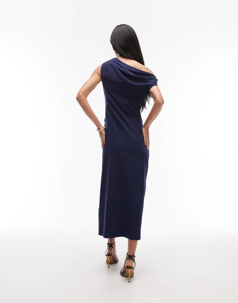 Draped Jersey Midi Dress With Boat Neck And Buckle Detail In Navy