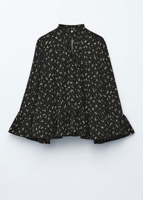 Long-sleeved blouse featuring a loosely draped neckline and puffed sleeves in a regular fit silhouette. Elastic loop and button cuffs. Self tie back strap.