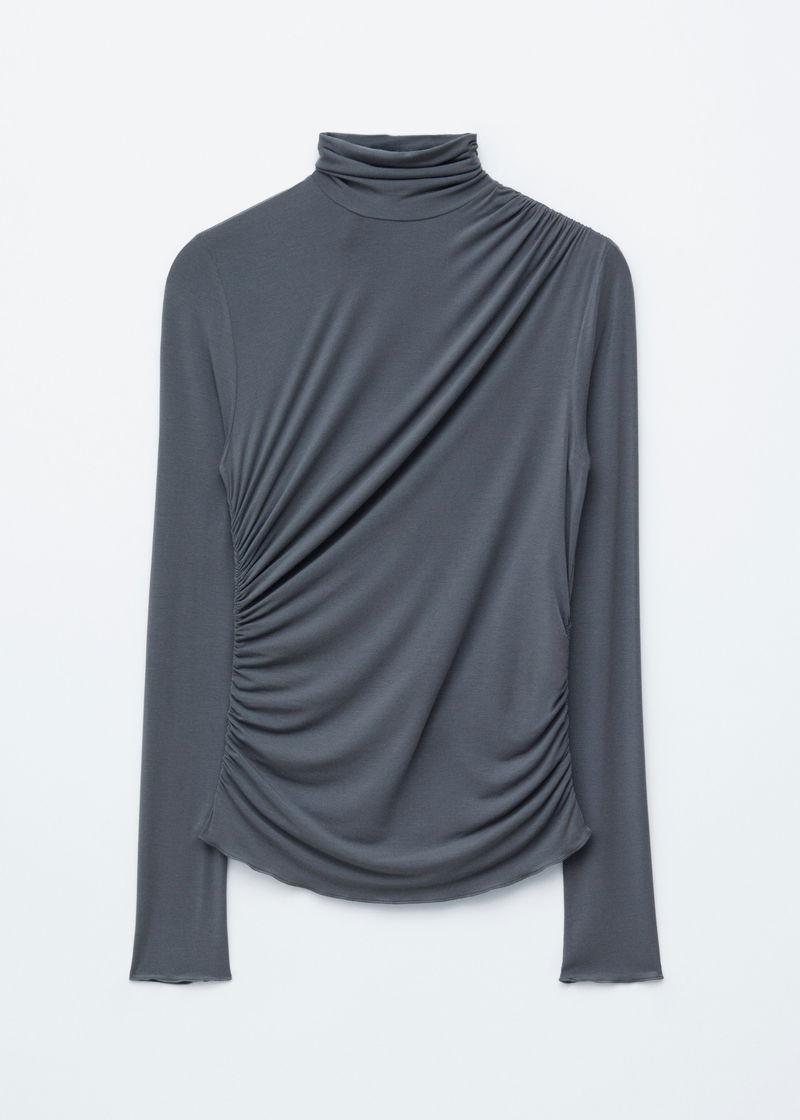 With gathered seams for an all-over draped effect, this asymmetric-hem top is crafted from fluid modal that further enhance the draping. Designed with a turtleneck, extra-long sleeves and overlocked edges at the cuffs and hem.