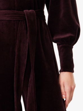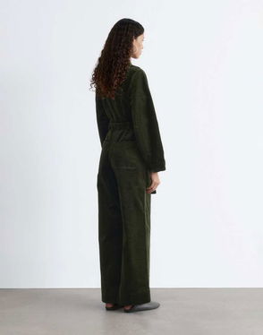 Short sleeve jumpsuit defined by a drawstring waist with a tonal self-tie belt.