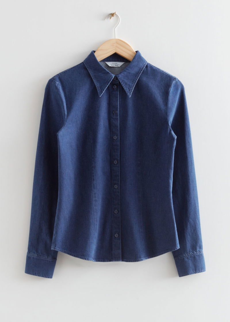 Fitted denim shirt with a pointed collar. Eight button closures. Buttoned cuffs.