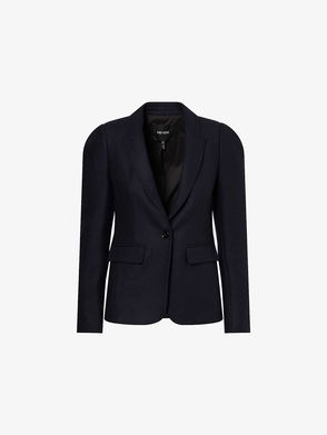 Single-breasted blazer designed with a notch lapel collar, long sleeves, and floral applications.