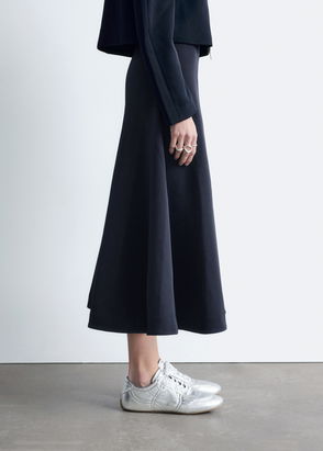 A-line midi skirt finished with an elasticated waistband. Featuring allover floral appliqués.