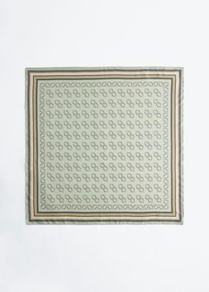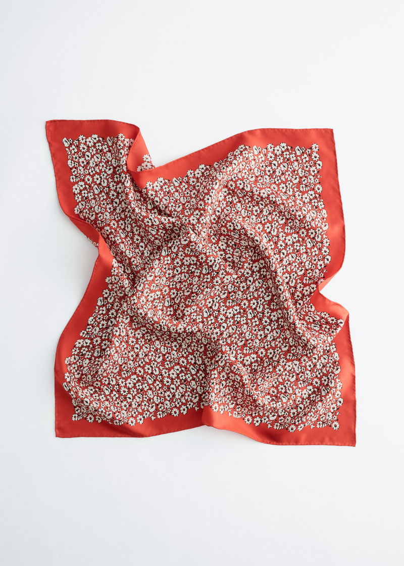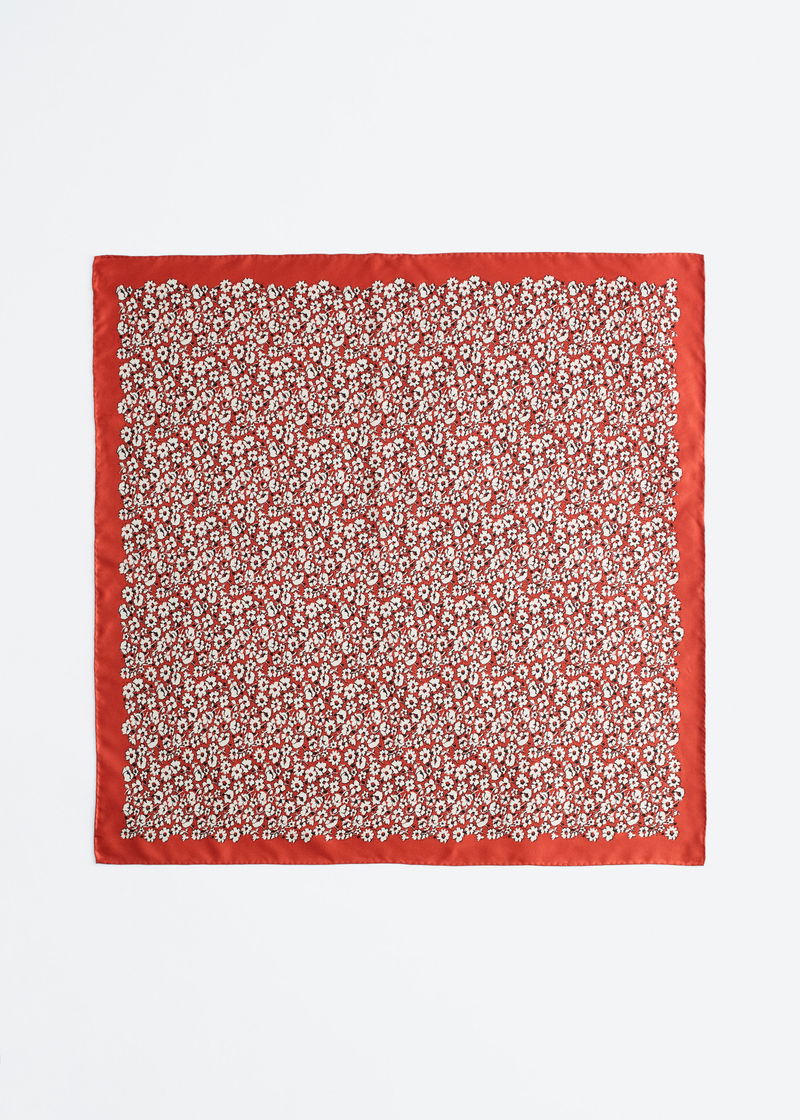 Crafted from pure mulberry silk, this square scarf features a vibrant micro-floral pattern. Wear it around the neck, draped over the shoulders, or tied to a bag for a versatile finishing touch.