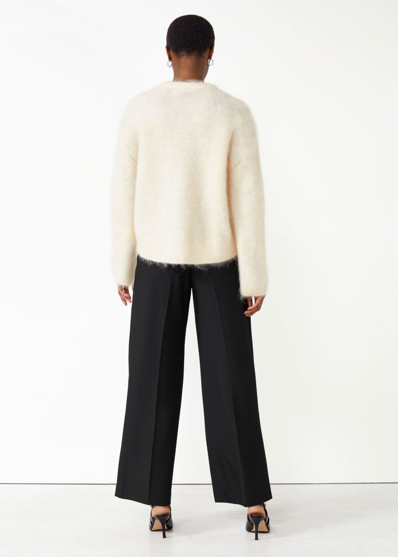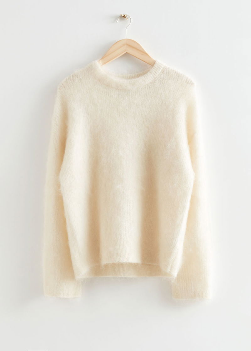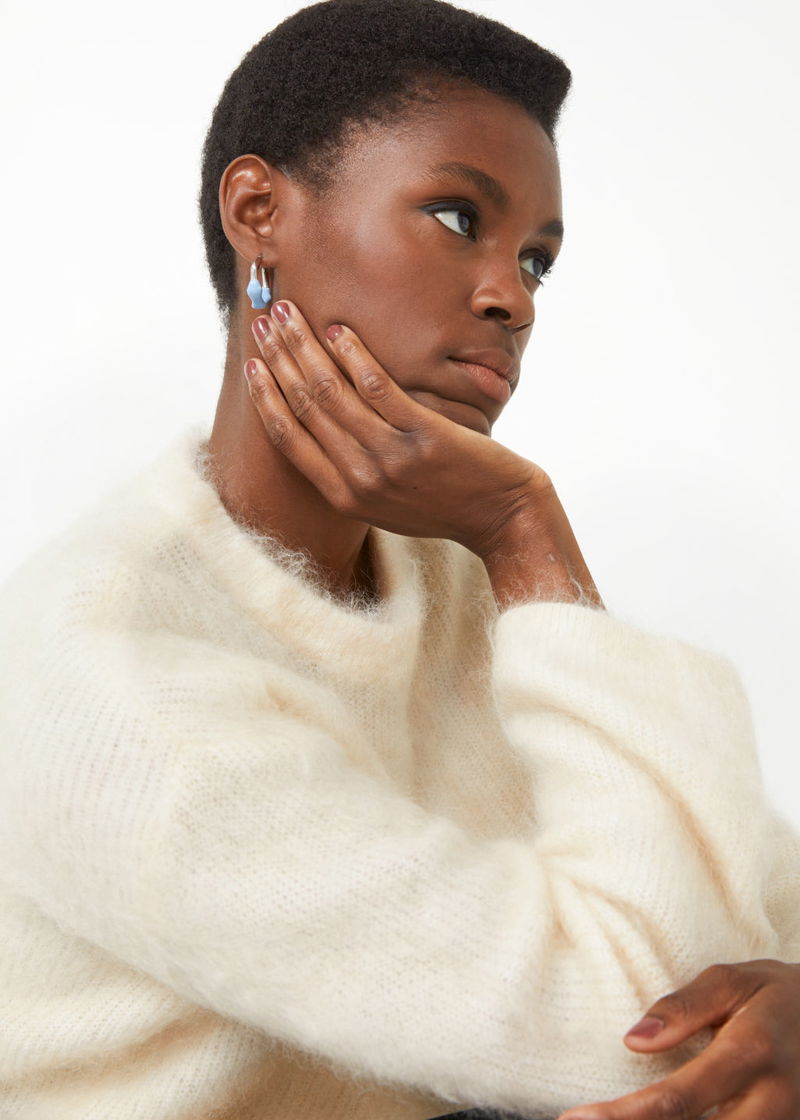 Relaxed long sleeve knit jumper with a fuzzy finish. Ribbed neckline, cuffs and hemline. L