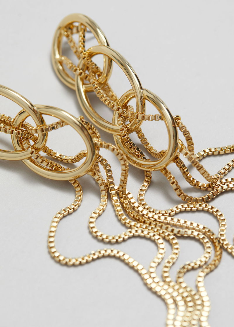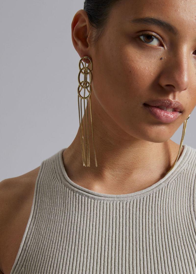 Earrings featuring hanging chain pendants and interlocking hoops that adorn the delicate chains. Finished with butterfly backings.