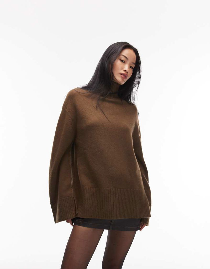 High Neck Relaxed Knitted Sweater In Mocha Brown