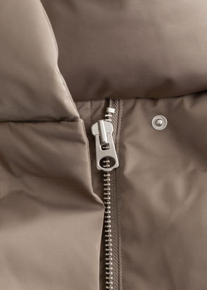 Oversized down puffer jacket featuring a detachable hood and an adjustable waistline.