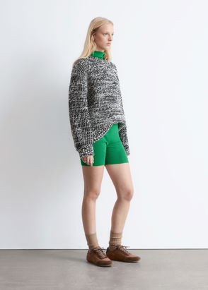 High-waist shorts with knee-length silhouette. Finished with duo slanted pockets. Relaxed fit. Zip fly with hook and bar closure Tab-detail at the waist. Duo flap pockets at the back.