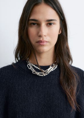 This sweater is knitted from a soft alpaca-wool blend, offering a warm and textured feel. Designed with a loose silhouette, it features dropped shoulders and long, wide sleeves. Finished with a round neck and ribbed trims.