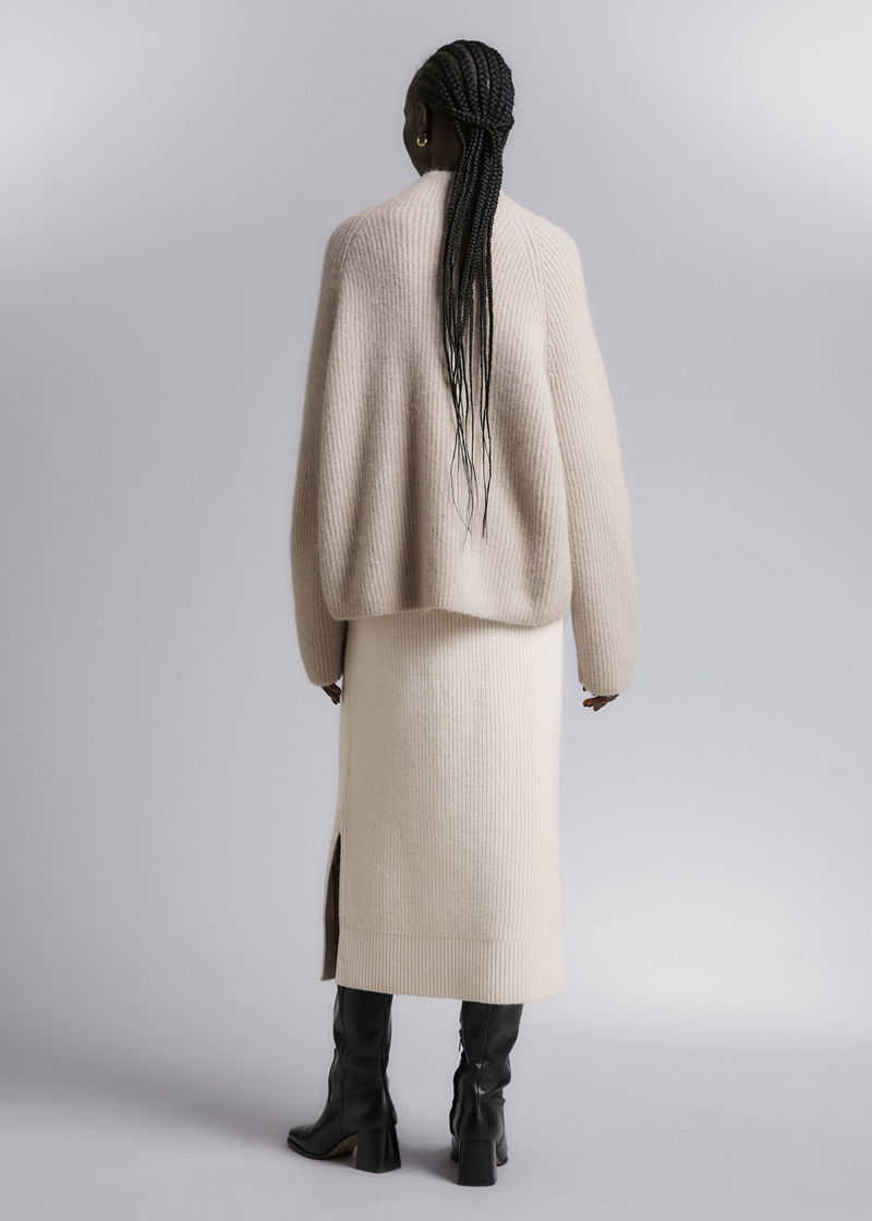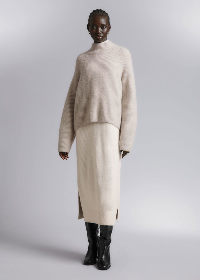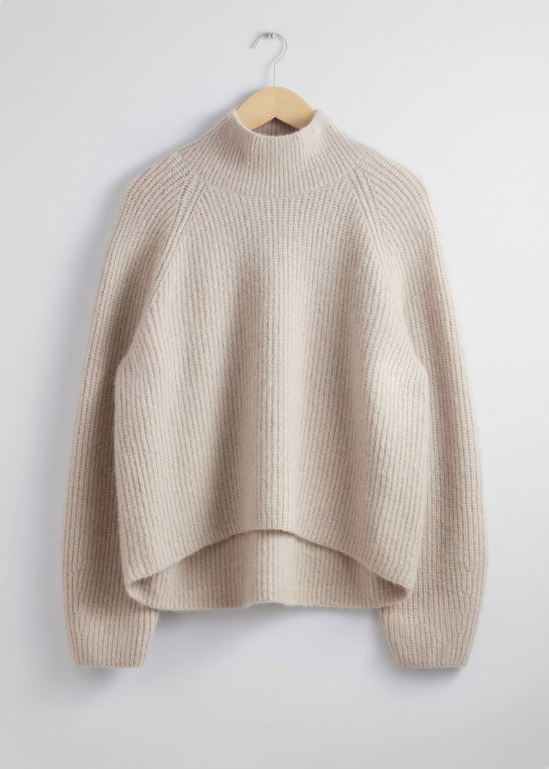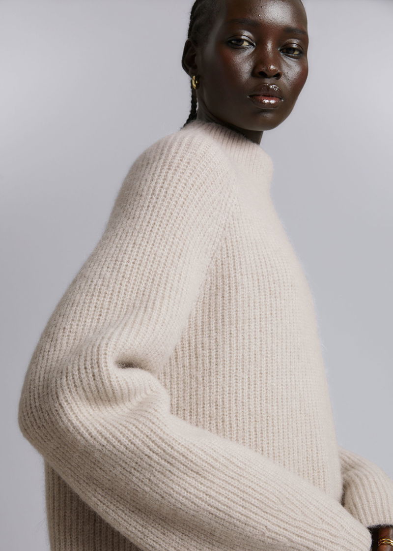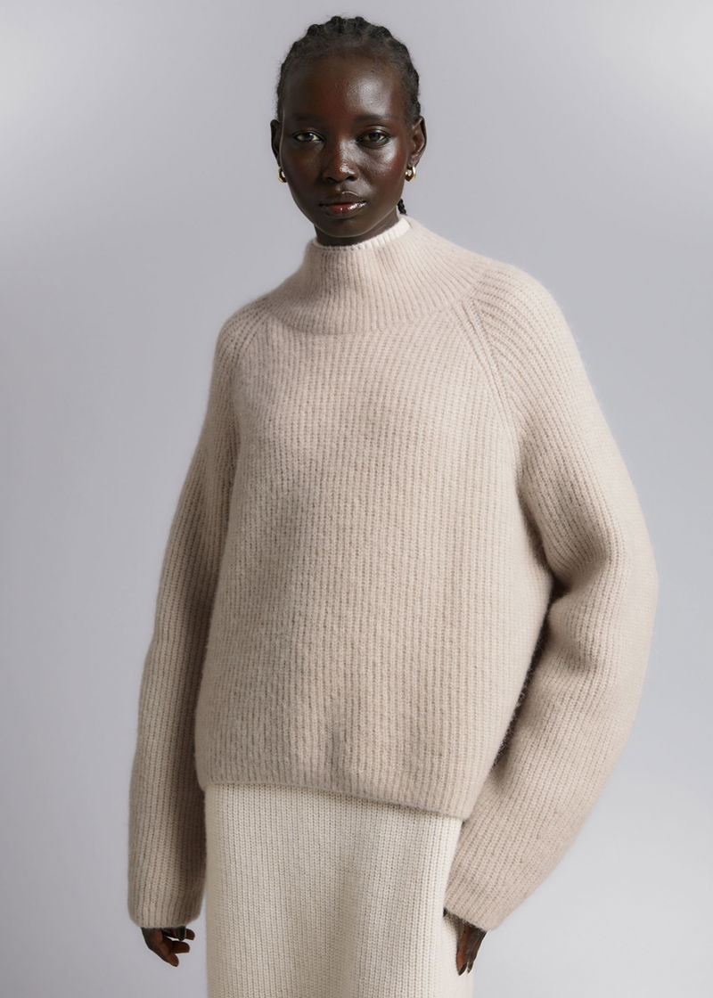 Relaxed ribbed mock neck jumper knitted from alpaca and merino wool.