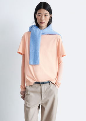 T-shirt crafted from a soft cotton jersey fabric. Designed with a round neck, three-quarter sleeves, and a knot-detail at the front creating a cinched waist with decorative gathers.