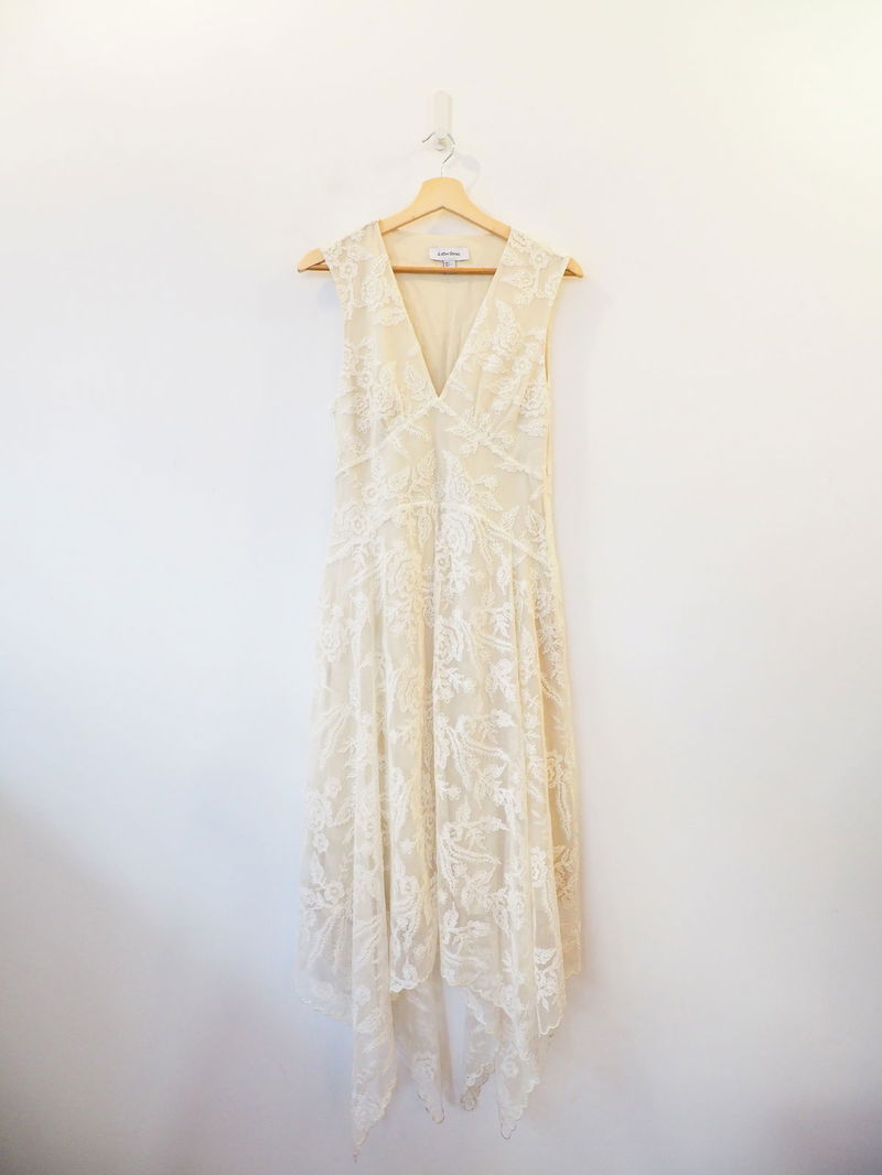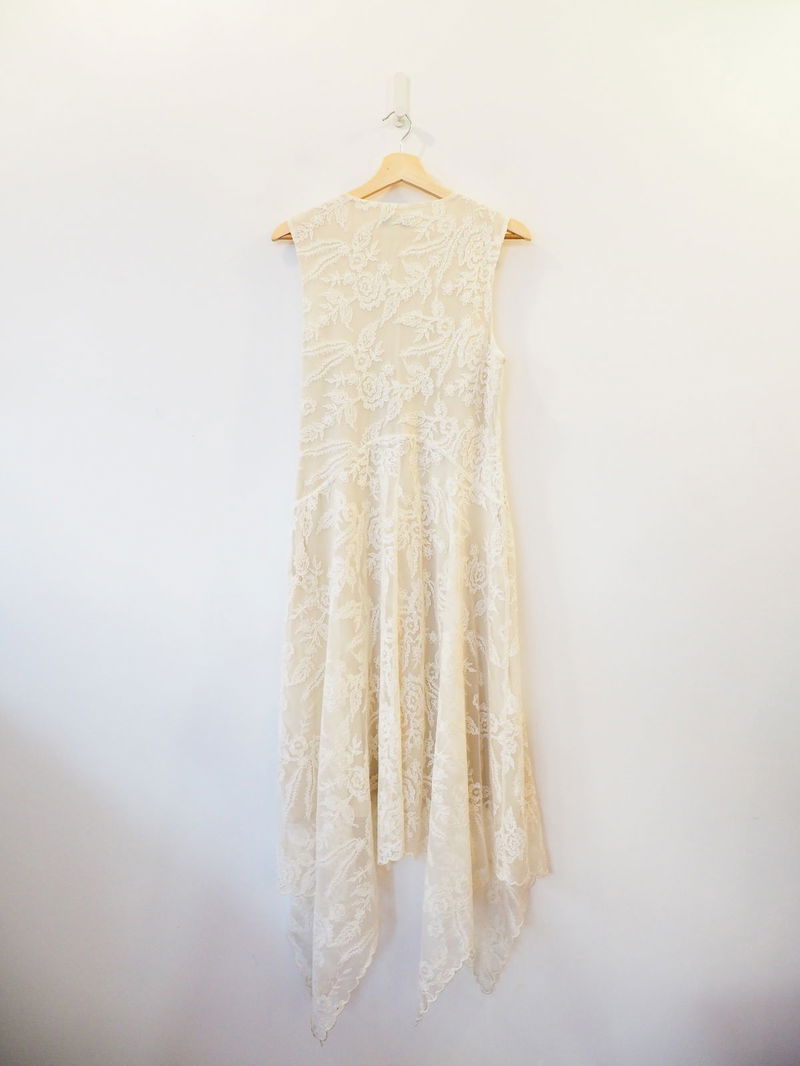 Sleeveless midi dress crafted from a delicate lace fabric. Designed with a v-neckline and a fitted waist that shapes into an asymmetrical handkerchief hem with draped gathers, accented by scalloped, embroidery trim. Finished with an invisible side zipper.