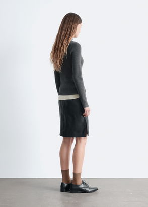 Knee length skirt that features a diagonal overlapping silhouette in a glossy leather finish.
