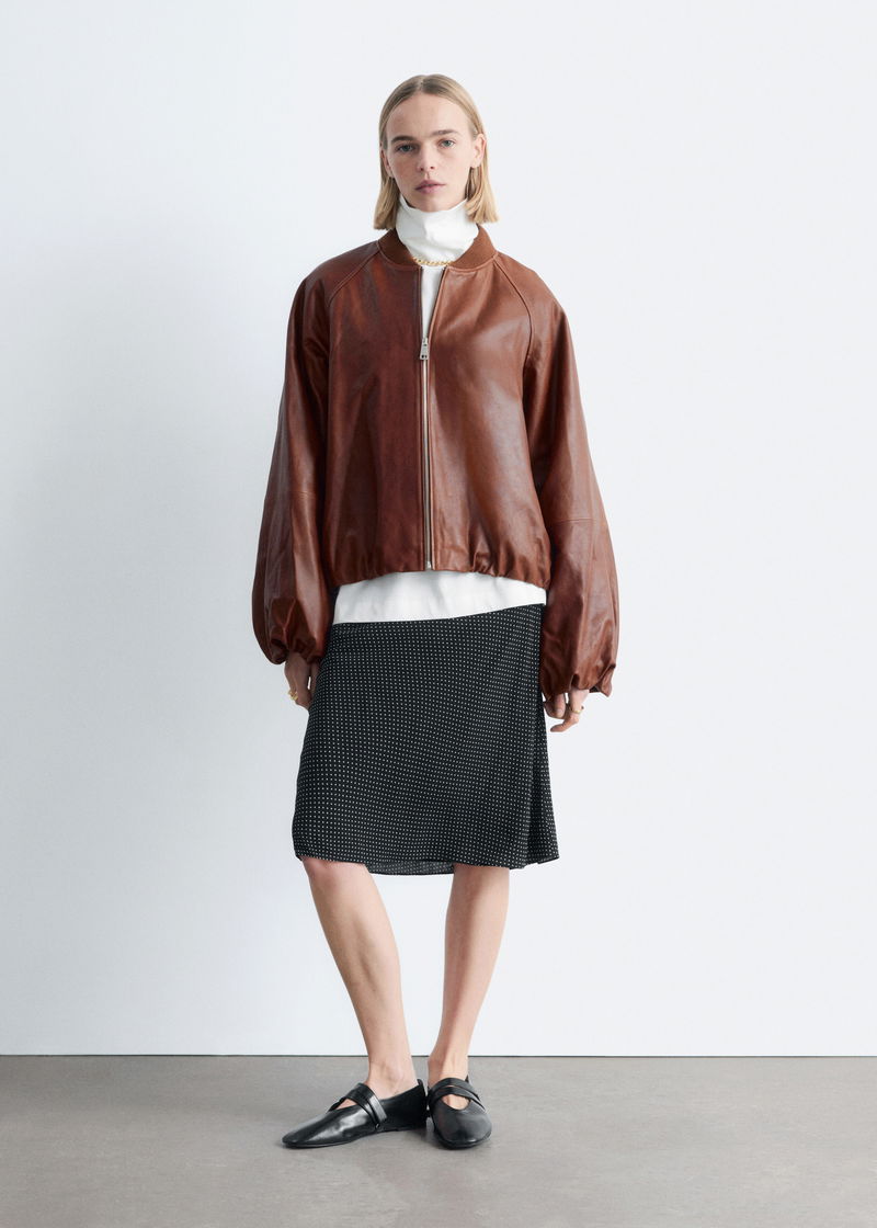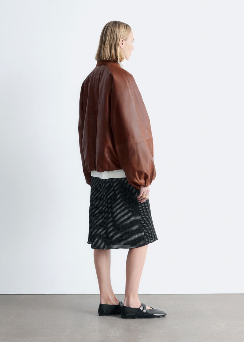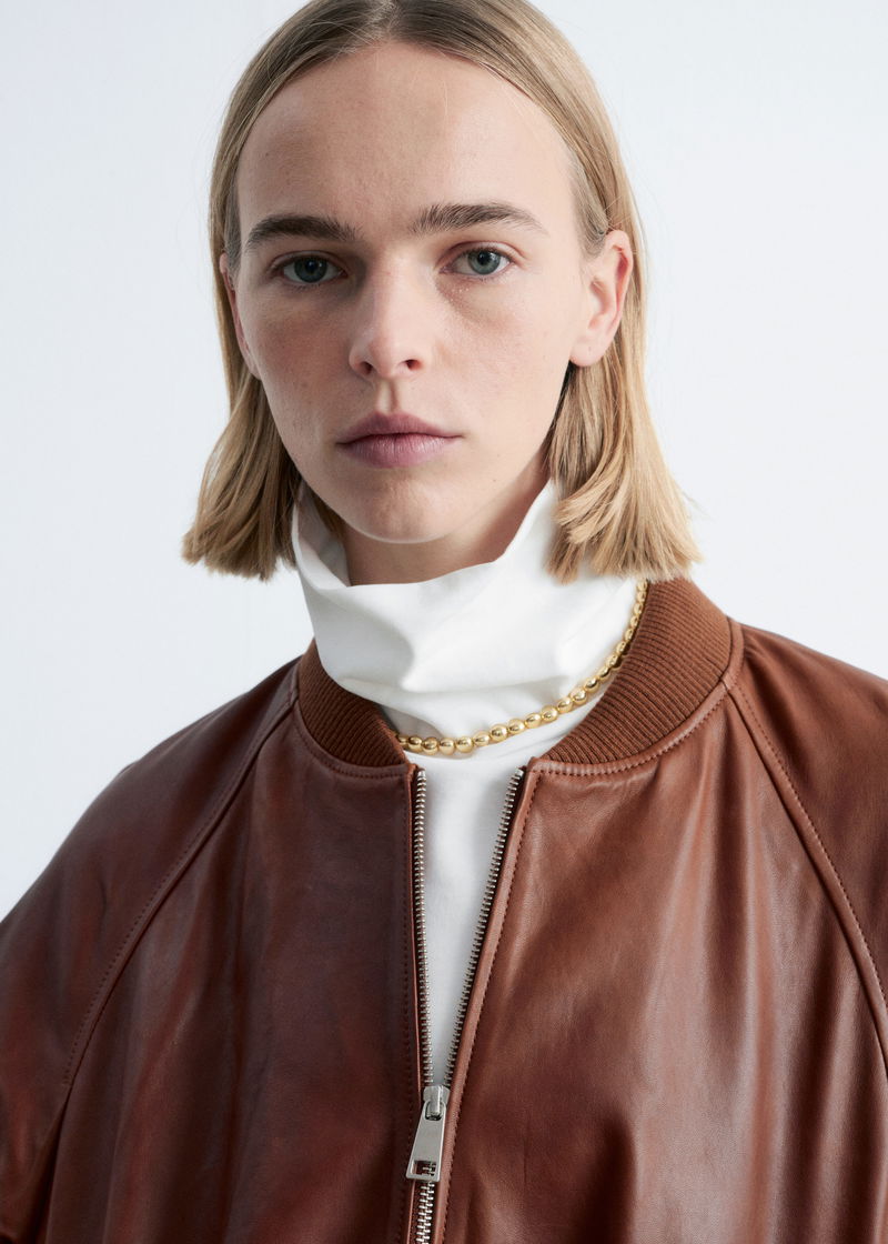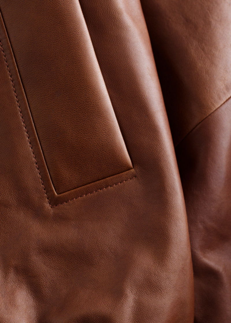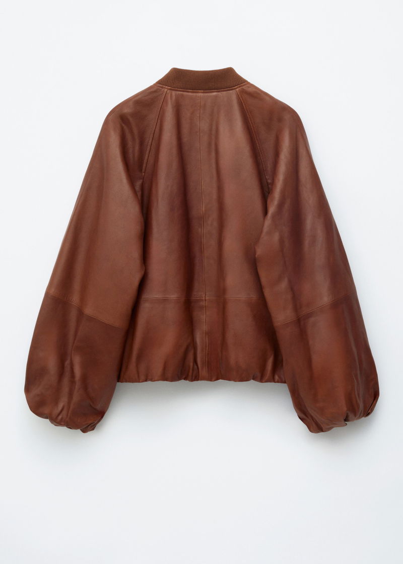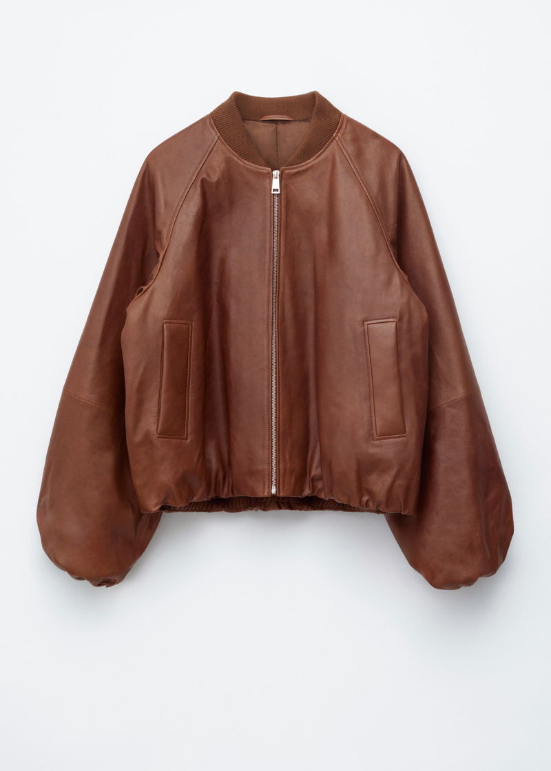 Crafted from leather, this classic bomber jacket is cut in a boxy silhouette with built-in padding for added volume. It features voluminous raglan sleeves, a ribbed neckline, and subtle puckering at the cuffs and hem. Finished with vertical welt pockets and a front zipper.