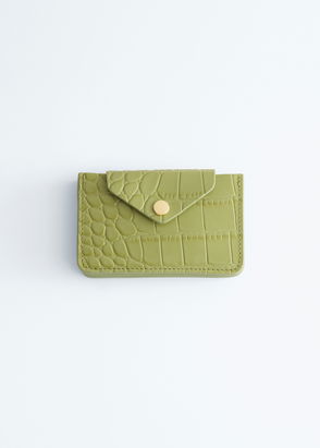 Crafted in India from crinkled leather, this cardholder features internal card slots, a flap with a press-stud closure, and a detachable snake chain shoulder strap for crossbody styling.