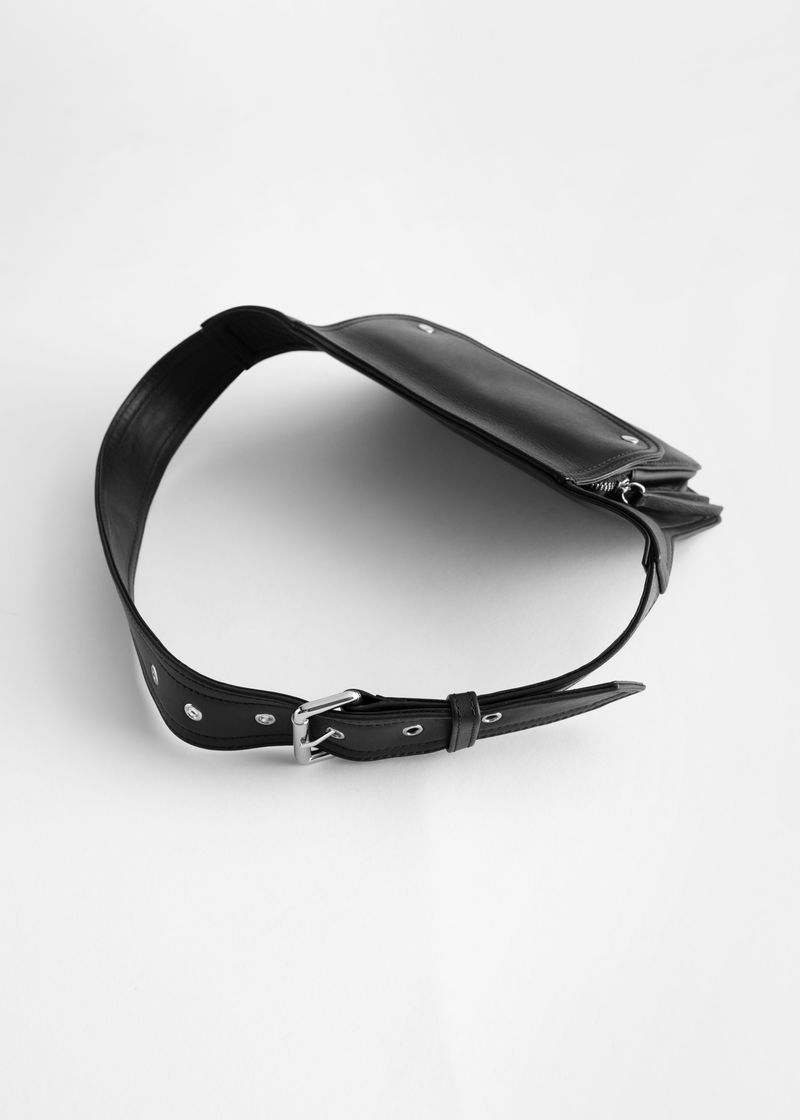 Soft leather belt bag with a slim silhouette, featuring a front zipper compartment that is partially hidden by a curved flap cover. Silver-toned hardware. Duo button flap closures. Leather pull tabs. Adjustable buckle strap.