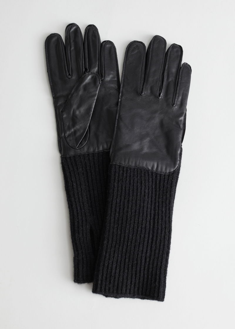 Soft leather gloves with long wool-blend cuffs in a ribbed knit finish for added warmth.
