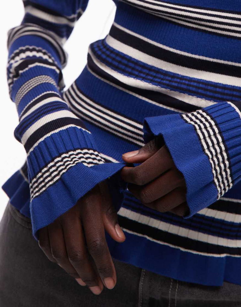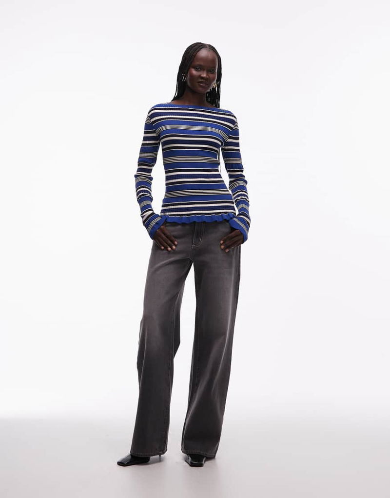 Long Sleeve Lightweight Knitted Top With Frill Edge In Blue Stripe