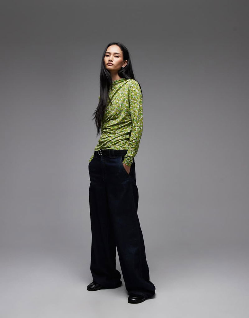 Long Sleeve Slinky Jersey Top In Green Floral Print