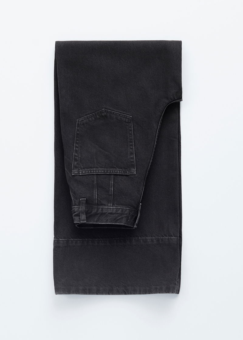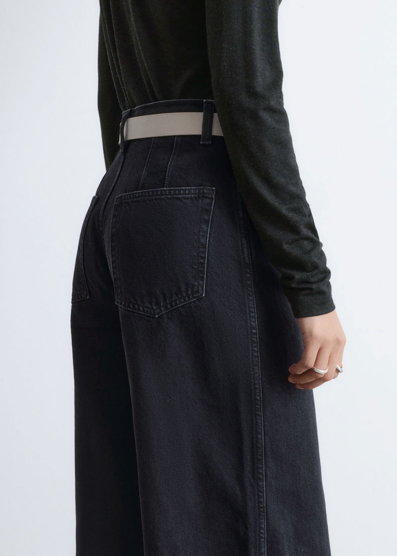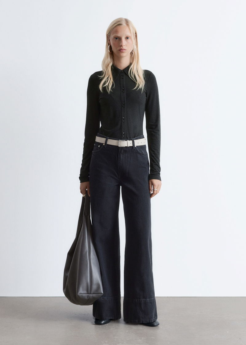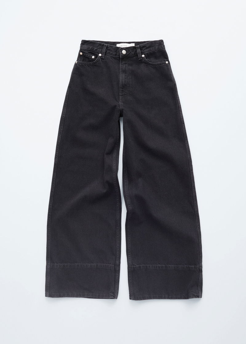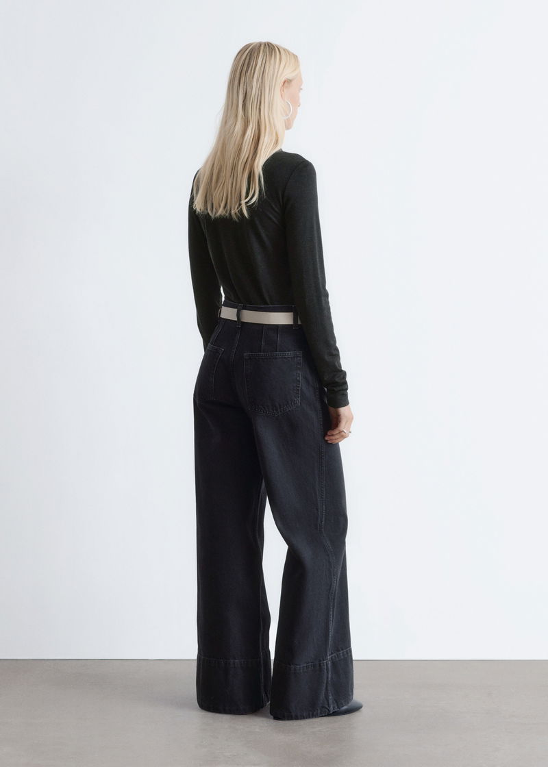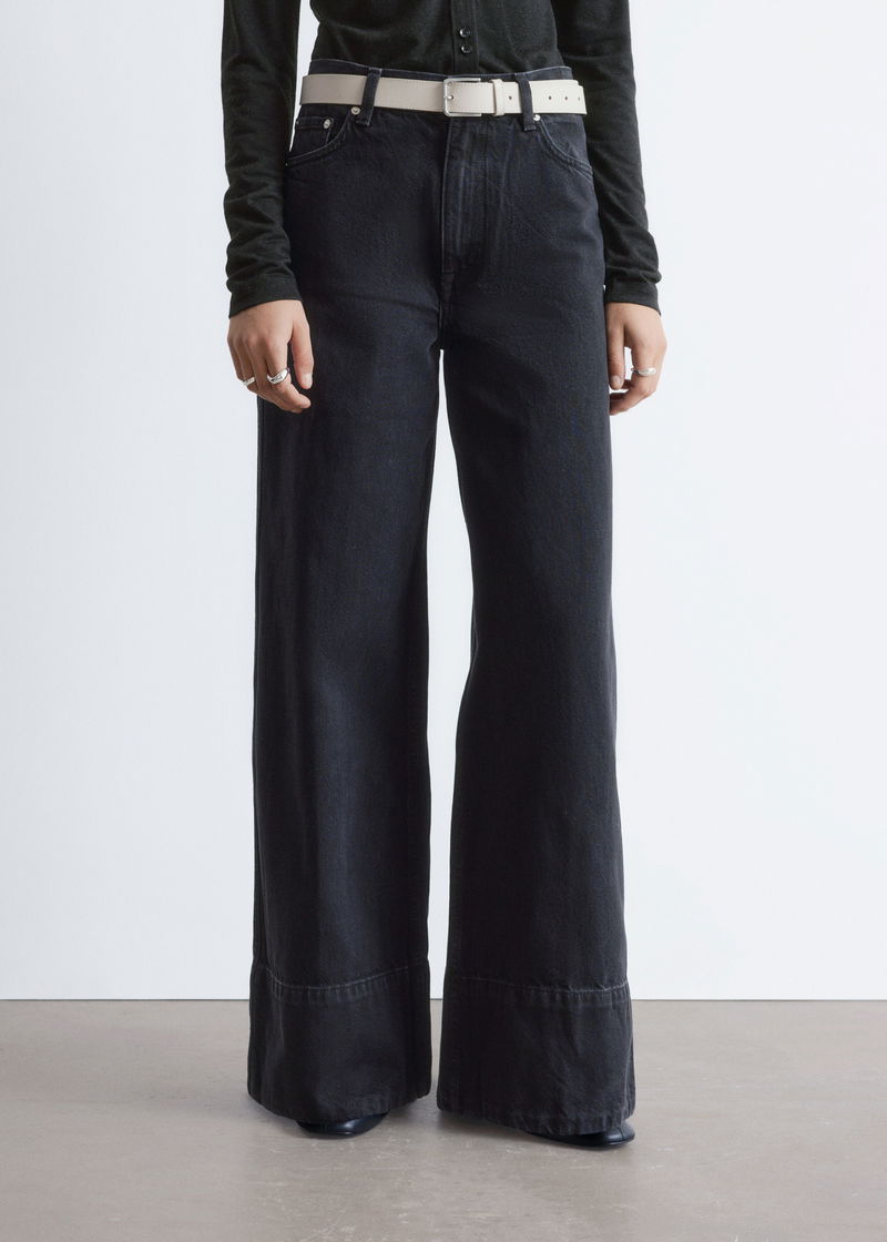 High-waist jeans featuring wide legs and a classic 5-pocket denim finish. Designed with a rigid 70s-inspired style, complete with a wide, topstitched hem for added flair.